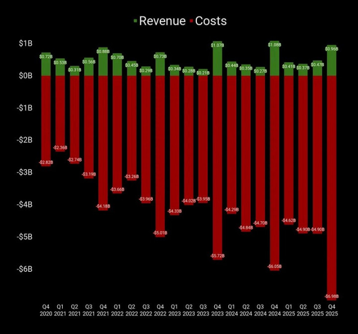 作为Meta旗下负责虚拟现实(VR)、Horizon Worlds及智能眼镜业务的核心部门,Reality Labs 第四季度的支出创下历史新高,接近70亿美元。结合该部门当季略低于10亿美元的营收来看,这一支出水平导致其产生了约60亿美元的亏损。